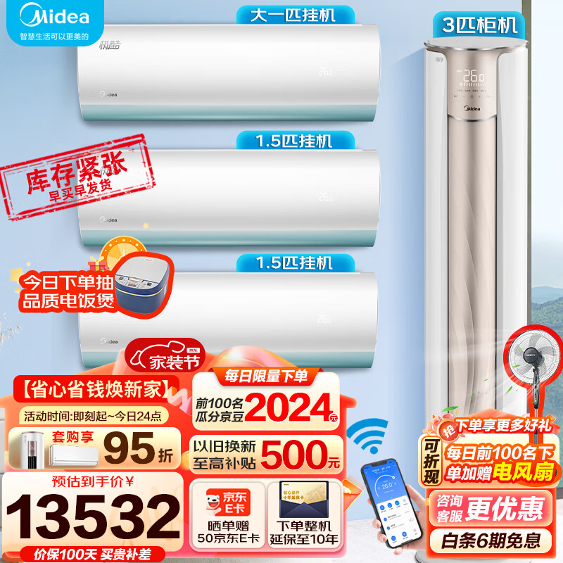 美的(Midea)空调套装 新一级能效 变频挂机柜机 立式空调客厅 3匹锐静+大1匹极酷+大1.5匹极酷(2台) 三室一厅 价格:13532.00元!