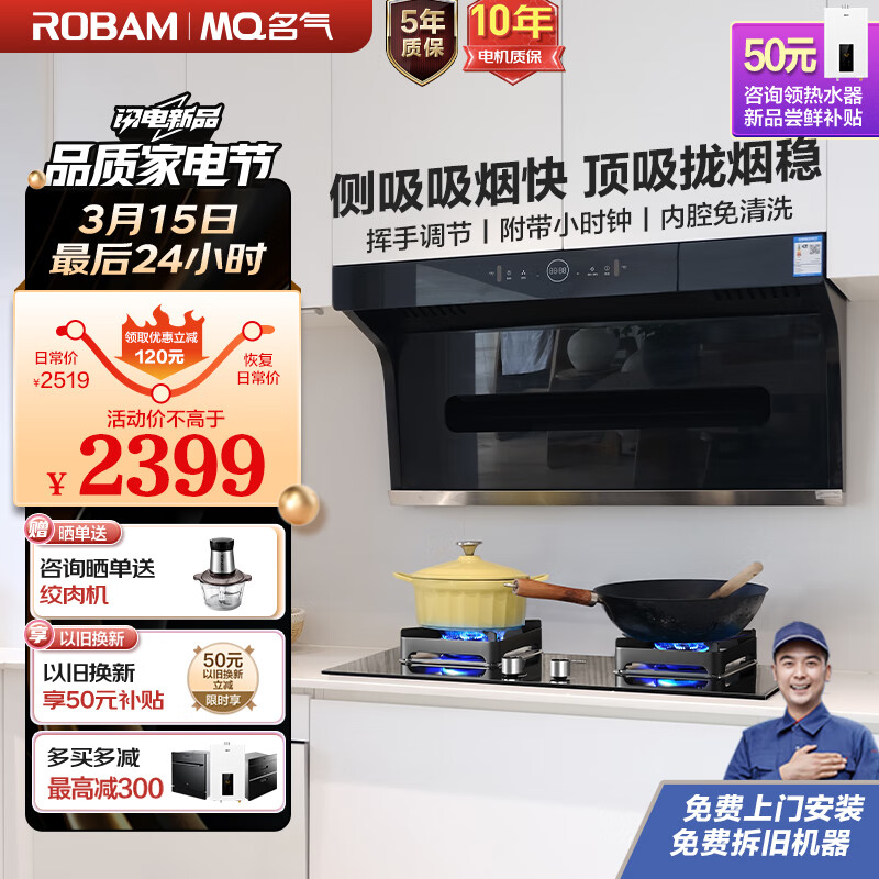 名气(MQ)老板抽油烟机自适应灶具23大吸力家用顶侧双吸烟灶套装天然气A5505+6510BT价格:2299.00元!