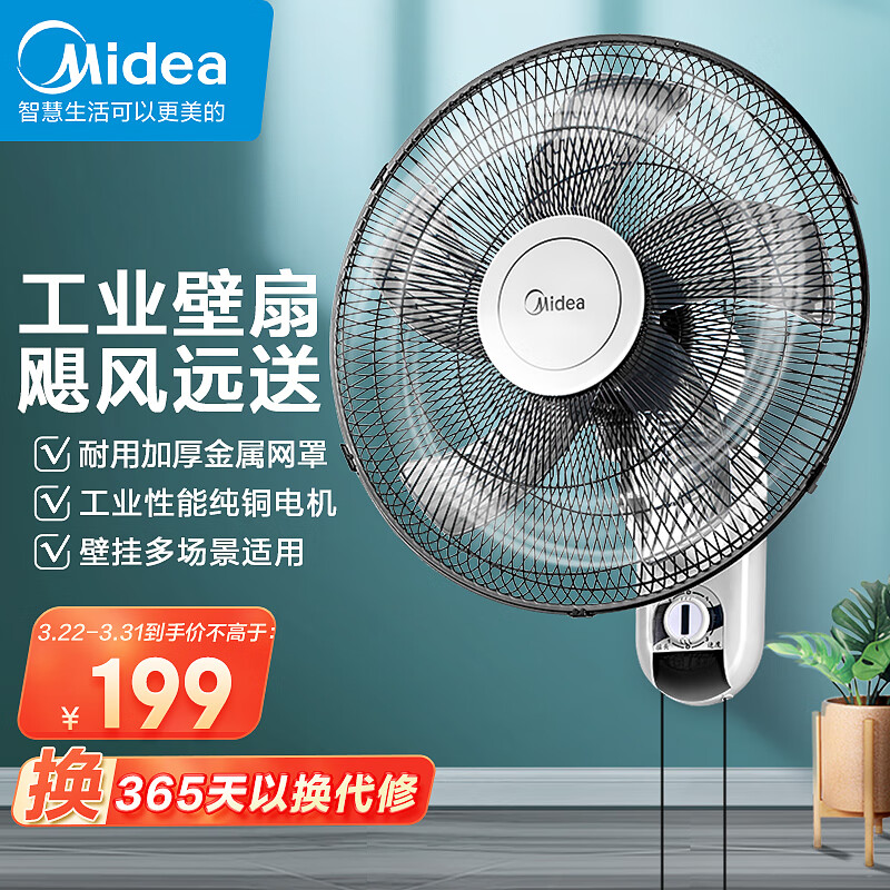 美的(Midea)【五叶大风力】壁扇/家用空气通风电风扇/节能低噪风扇/工厂通风吊扇/商用款广角摇头风扇 FWA40YA价格:219.00元!