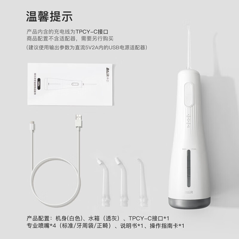 拜尔(BAIR)M6s电动冲牙器家用式便携 清洁口腔洗牙器水牙线冲洗器洁牙器牙套清洗充压 男送女朋友礼物实用 素白色丨力度自由调节 4支喷头价格:339.00元!