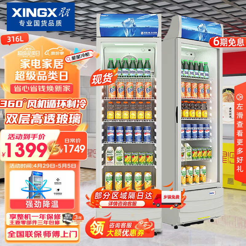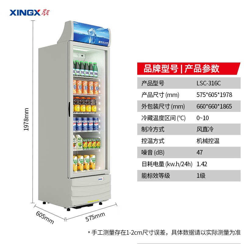 星星(XINGX) 316升 立式玻璃门展示柜冷柜 饮料陈列柜 商用冷藏冰箱(银灰色) LSC-316C价格:1399.00元!