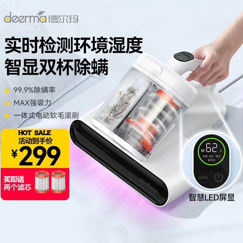 德尔玛(Deerma)CM990 除螨仪 双杯智能除螨仪家用手持除螨机床上紫外线99.9%杀菌除螨虫拍打去螨虫60°热风烘干价格:329.00元!