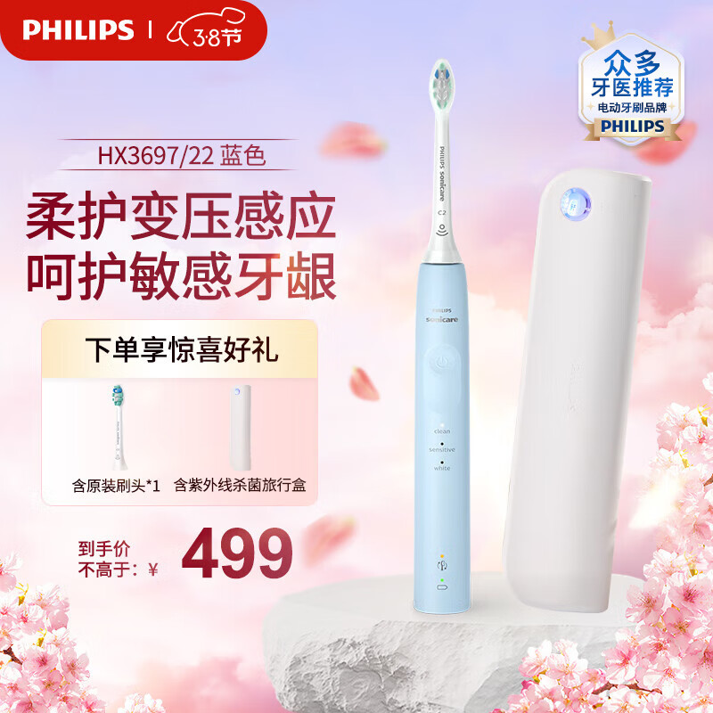 飞利浦(PHILIPS)电动牙刷成人 健康护龈系列情侣款牙刷 带紫外线杀菌牙刷盒 3种模式 生日/新年礼物送男友/女友 HX3697/22蓝色价格:499.00元!