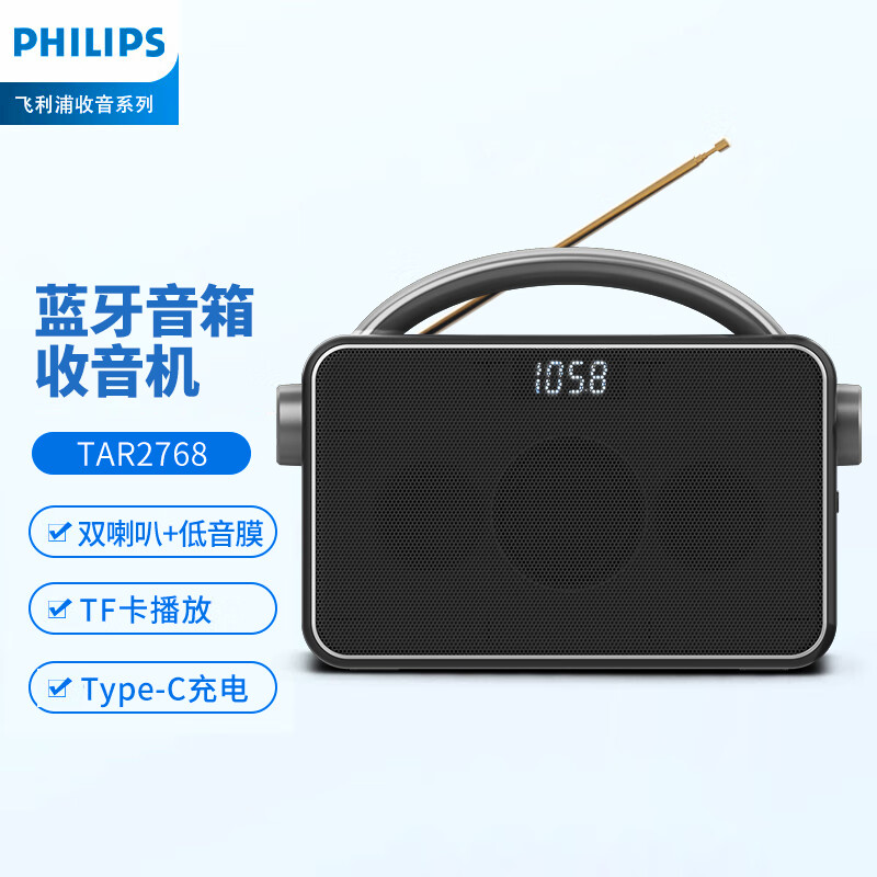 飞利浦(PHILIPS)TAR2768 收音机 蓝牙音箱 户外家用便携充电立体声老人多功能音乐播放器音响 黑色价格:499.00元!