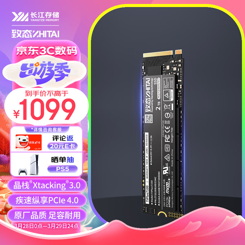 致态(ZhiTai)长江存储 2TB SSD固态硬盘 NVMe M.2接口 TiPlus7100系列 (PCIe 4.0 产品)价格:1099.00元!
