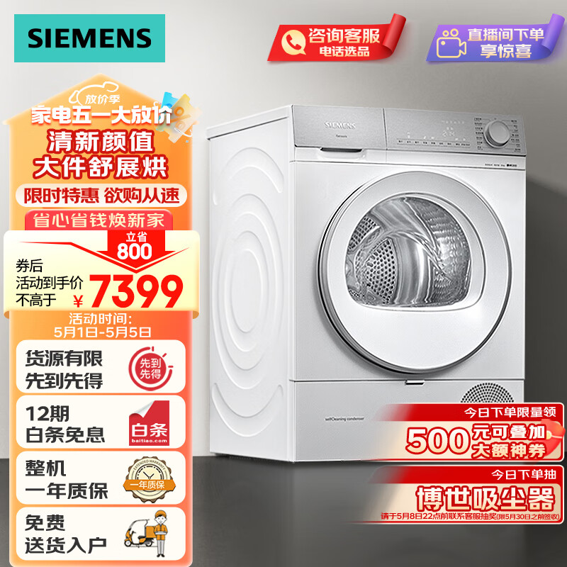 西门子(SIEMENS) 烘干机家用 10公斤热泵干衣机 清新颜值 防缠绕舒展烘 蚕丝被专护 除菌除螨 WQ55B2D00W价格:8699.00元!