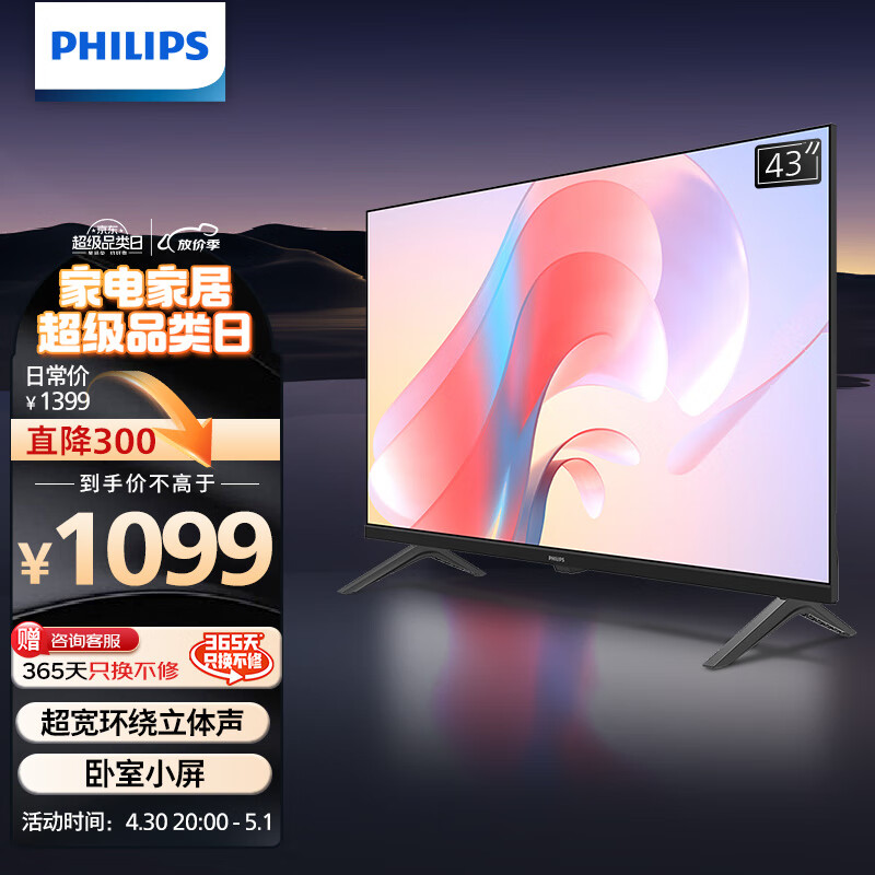 飞利浦(PHILIPS)43英寸全高清智慧屏 老人卧室小屏投屏电视 网络智能投屏液晶平板电视机 43PFF6309/T3以旧换新价格:1099.00元!