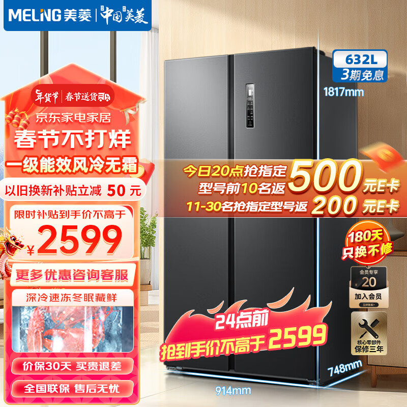 美菱(MeiLing)冰箱632升对开门冰箱双开门一级能效双变频风冷无霜低噪音嵌入式大容量家用电冰箱 BCD-632WPUCX 典雅灰价格:2599.00元!
