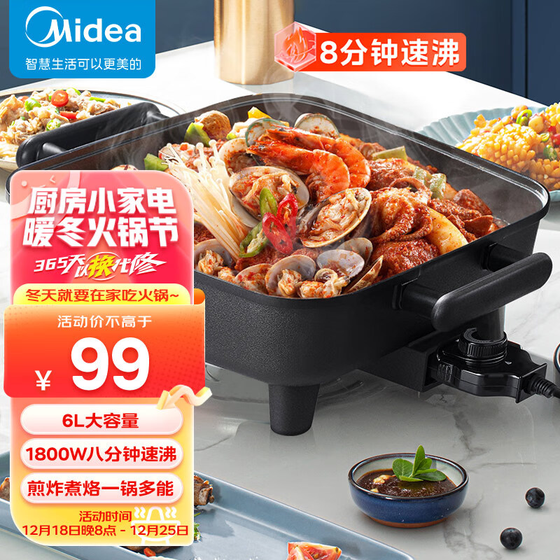 美的(Midea)电火锅 电炒锅家用多功能电锅煎烤涮一体电热电煮锅6L 火锅锅不粘烤鱼锅DY3030Easy101价格:99.00元!