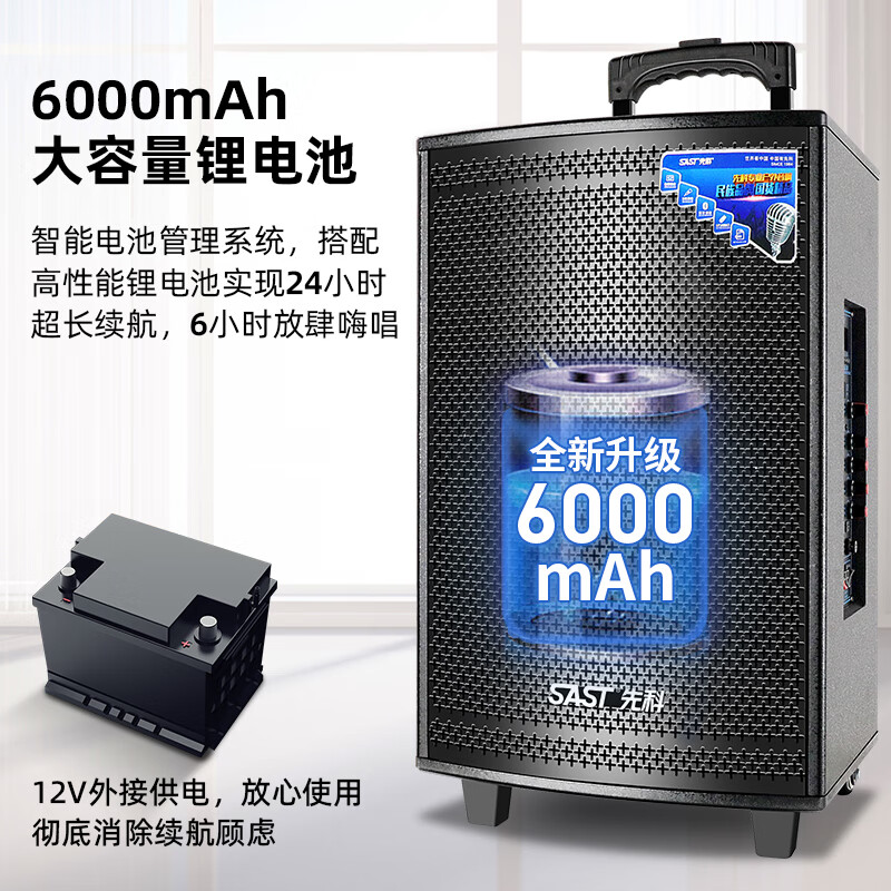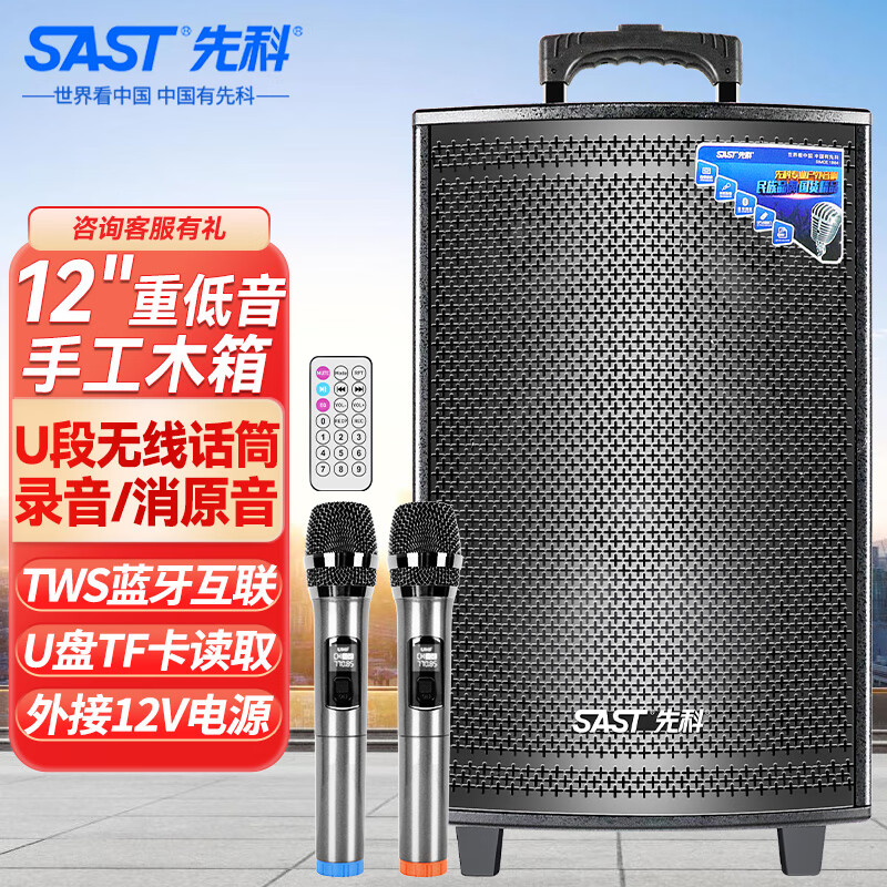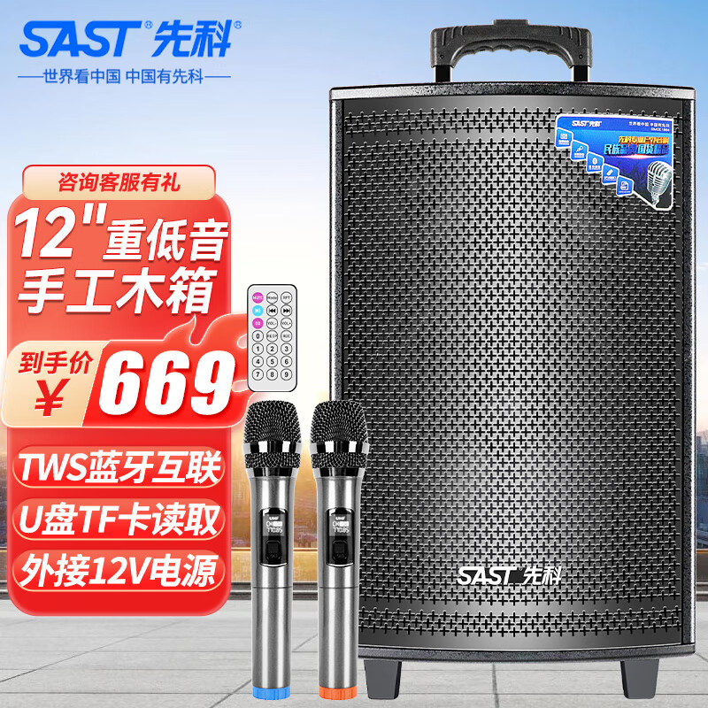 先科SA-122 12英寸广场舞音响户外大功率移动拉杆音箱无线蓝牙大音量K歌专用便携式配双话筒 长续航版价格:669.00元!