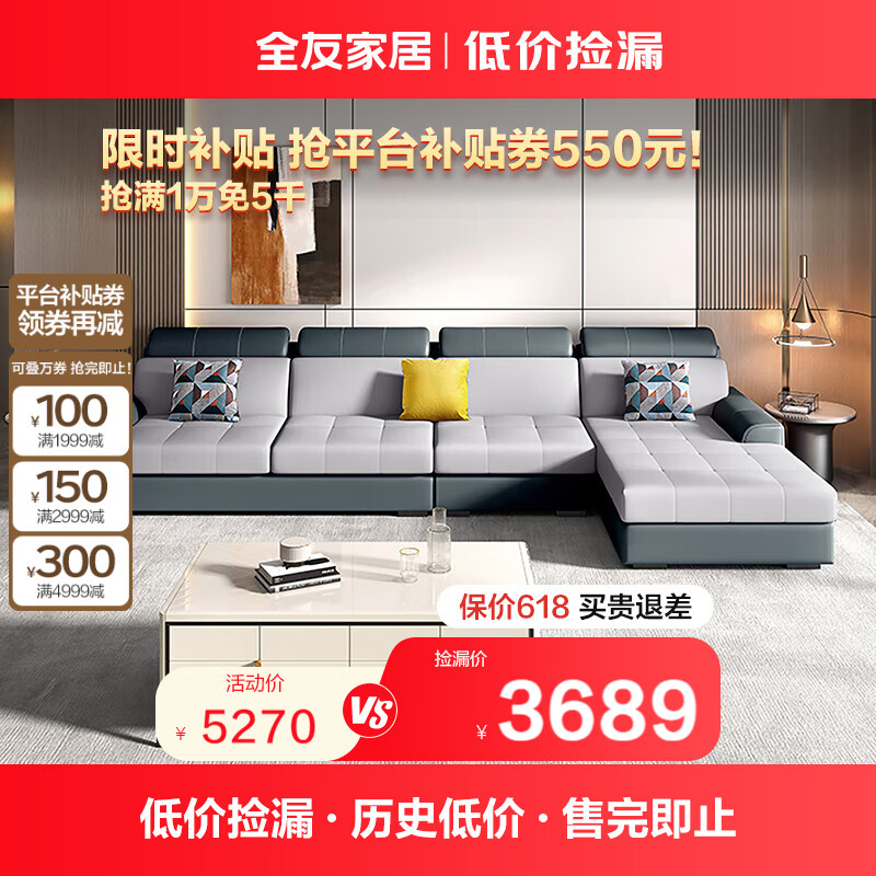 全友家居 现代简约客厅沙发家具大户型贵妃位转角科技布艺沙发102251价格:5270.00元!