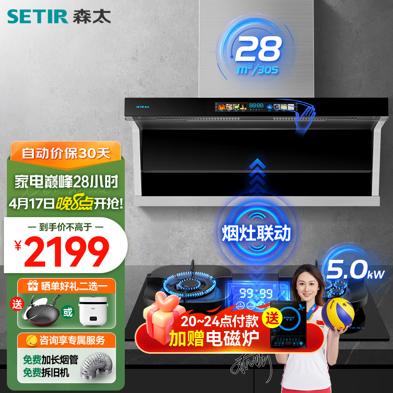 森太(SETIR)油烟机燃气灶套装 1100Pa直流变频抽油烟机加厚不锈钢家用定时灶烟灶两件套 BA88BGL+TM81液化气价格:2499.00元!