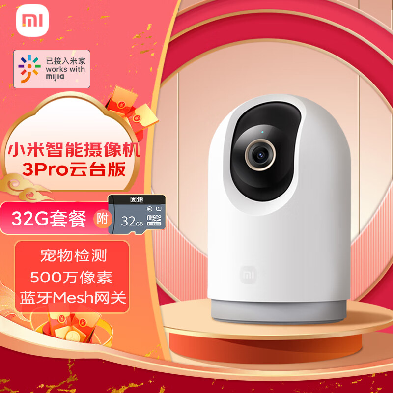 小米智能摄像机3Pro云台版+32G存储卡 监控摄像头婴儿看护器500w像素双向语音对讲内置蓝牙mesh网关价格:338.90元!