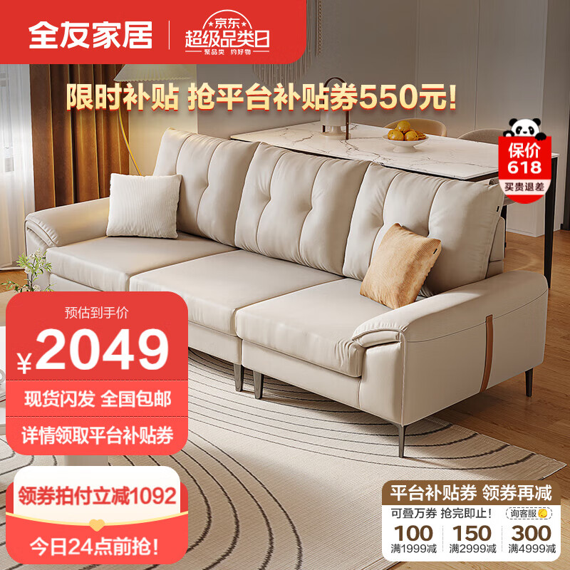 全友家居 科技布沙发客厅简约现代奶油风小户型直排式布艺沙发111037价格:3141.43元!