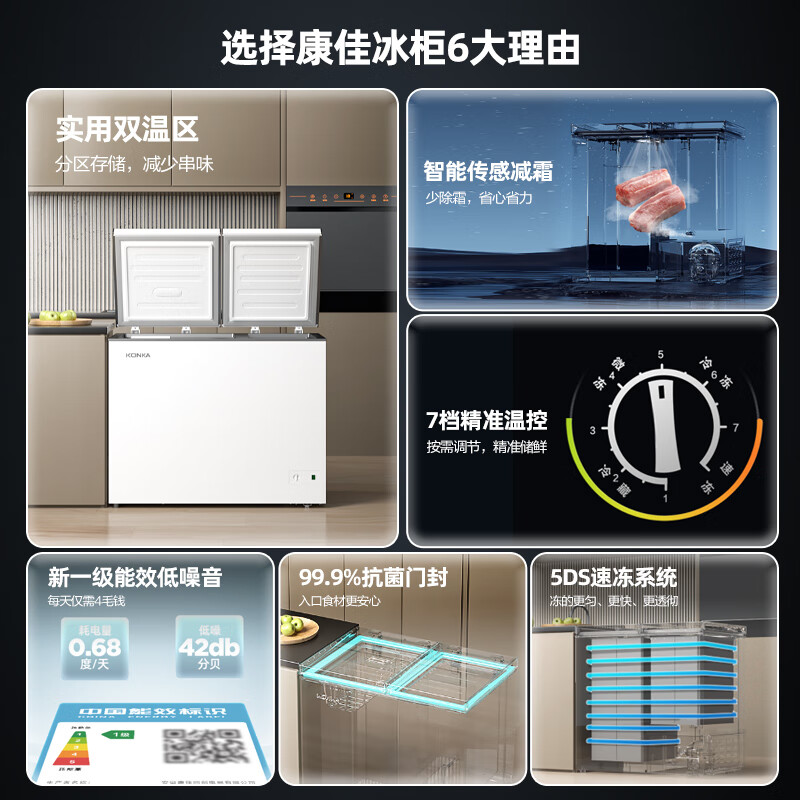 康佳301升 大容量家用商用冰柜 双箱双温冷柜 顶开门 一级能效 冷藏冷冻卧式冰箱BG30AS价格:1249.00元!
