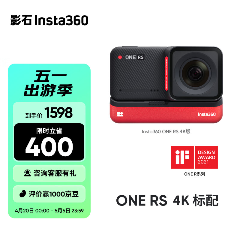 Insta360影石 ONE RS模块化运动相机防抖4K高清Vlog摩托车骑行滑雪潜水路亚(4K增强版)价格:1598.00元!