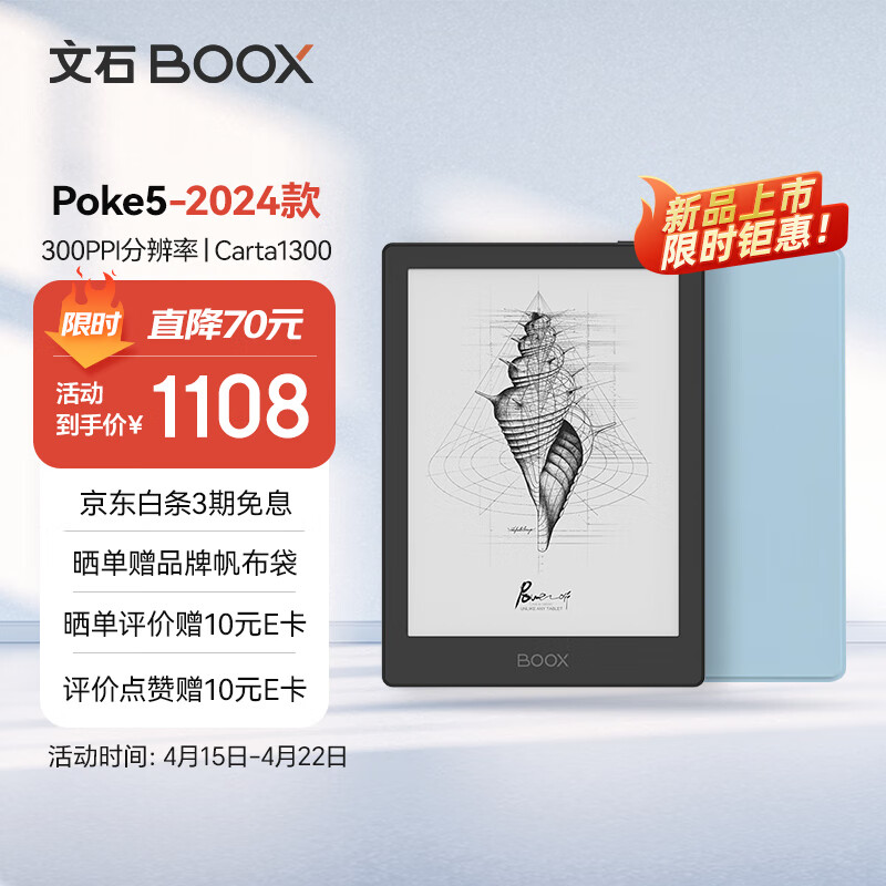 BOOX文石 Poke5 2024版本 6英寸电子书阅读器 墨水屏电子书电纸书电子纸 智能阅读便携 蓝色保护套套装价格:1108.00元!