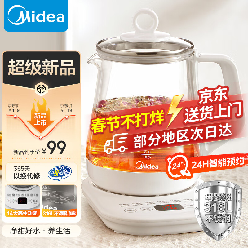 美的(Midea)养生壶 316L不锈钢1.5L煮茶壶 24小时预约烧水壶 12小时恒温 11档控温 电热水壶 MK-YSP1508价格:99.00元!