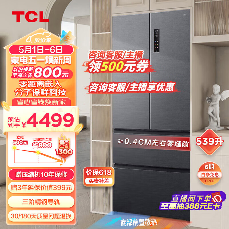TCL 539升T9法式四门超薄零嵌入式冰箱底部散热分子保鲜杀菌除味双循环一级能效家用电冰箱R539T9-DQ价格:5399.00元!