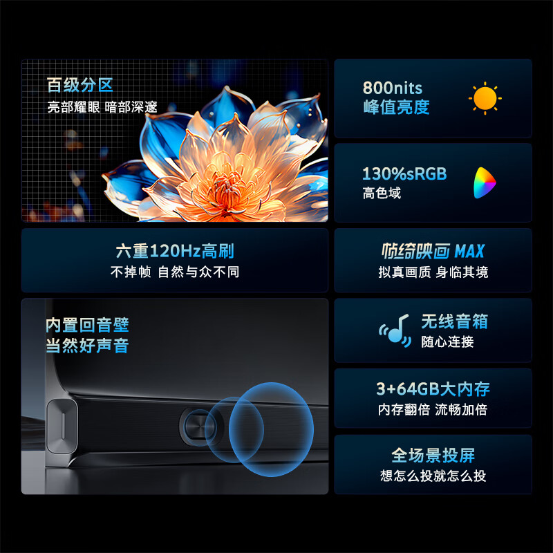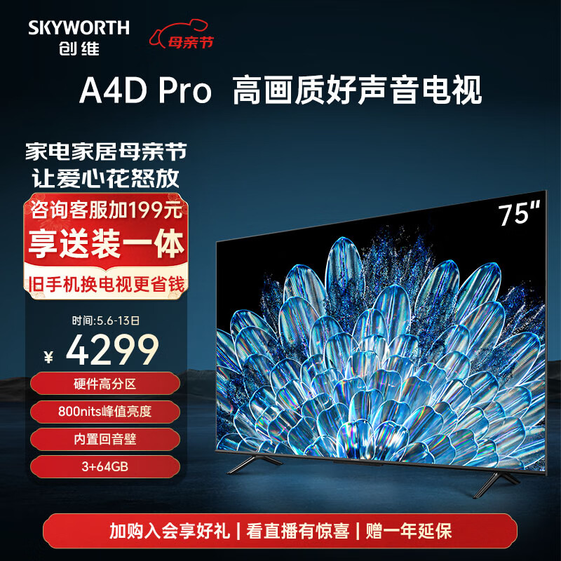 创维电视75A4D Pro 75英寸电视机原彩抗光屏800nit亮度内置回音壁高分区120Hz高刷液晶防蓝光护眼电视价格:4199.00元!