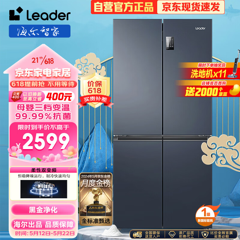 Leader 海尔智家出品469升一级能效大容量风冷无霜变温十字对开门四开门超薄家用电冰箱BCD-469WGLTDEDBX价格:2799.00元!