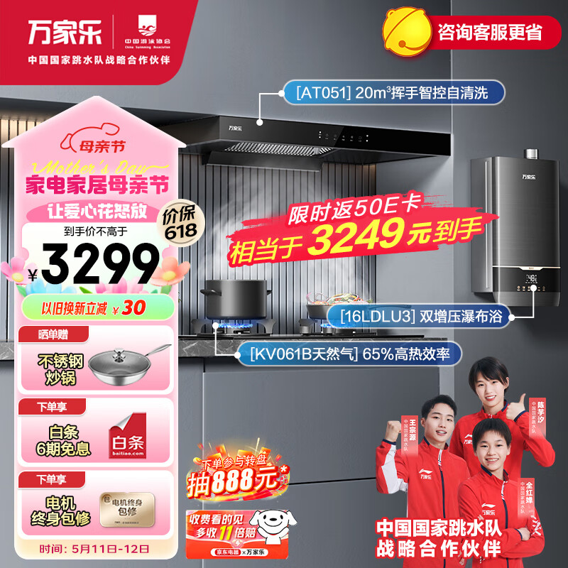 万家乐 抽油烟机 欧式20m3/min自清洗油烟机燃气灶热水器烟灶热厨卫三件套装AT051+KV061B+16LDLU3天然气价格:3499.00元!