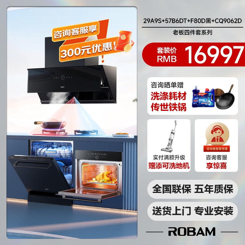 老板(Robam)26风量侧吸抽油烟机燃气灶灶具15套洗碗机蒸烤一体机厨房多件套29A9S+57B6DT+F80D黑+CQ9062D价格:16997.00元!
