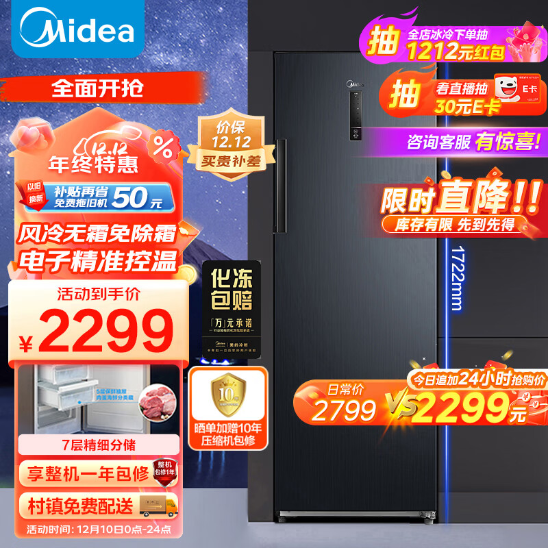 美的(Midea)240升 风冷无霜家用立式冰柜 电子控温冷藏冷冻转换抽屉式冰柜小型全冷冻冰箱 BD/BC-240WEA价格:2399.00元!