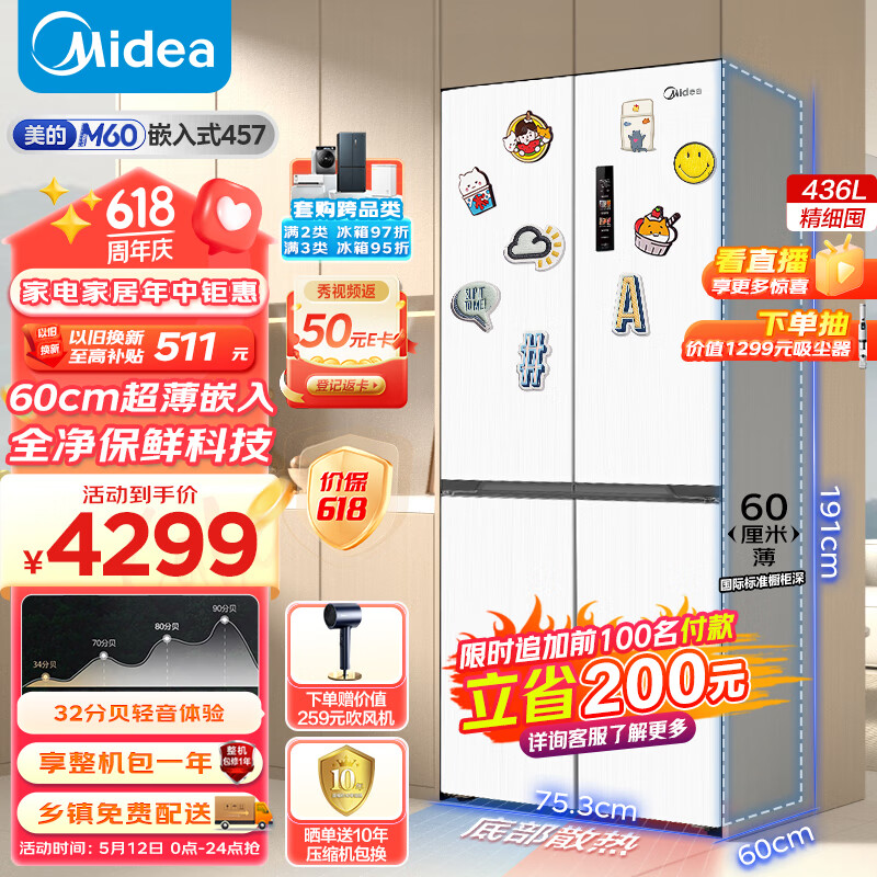 美的(Midea)M60系列60cm薄457平嵌超薄嵌十字双开四开门多门白色一级变频风冷无霜家用智能电冰箱MR-457WUSPZE价格:4499.00元!