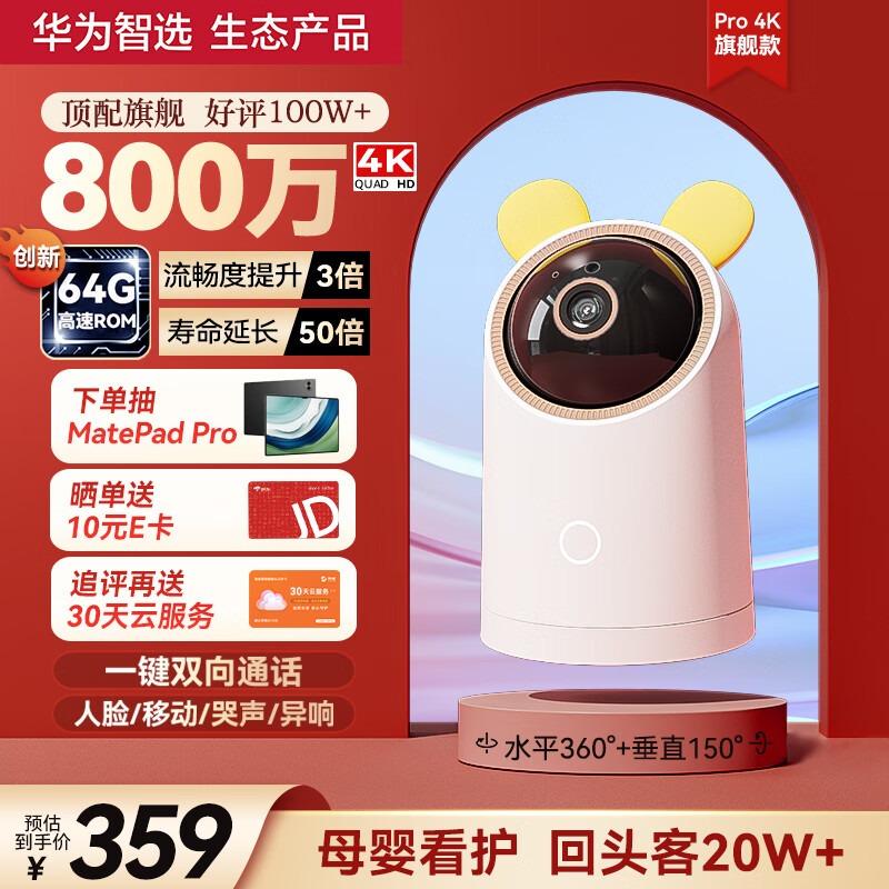 华为智选海雀4K 800万摄像头家用监控器360度自动旋转带夜视全景语音手机远程看护母婴儿哭声侦测室内云台价格:429.00元!