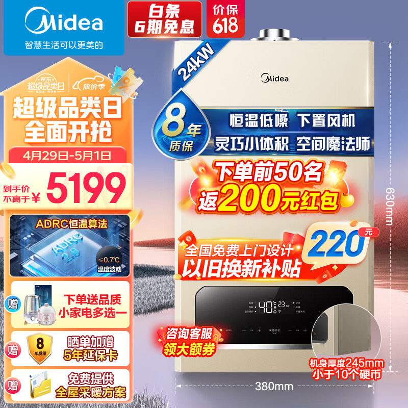 美的(Midea)双变频省气 一级低噪 舒适恒温燃气壁挂炉 天然气供暖 采暖地暖 家用锅炉省气 下置风机L1GB24-R05价格:5499.00元!