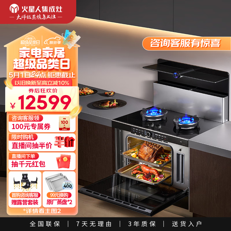 火星人集成灶T70BC 集成灶一体式 爆炒23风量大吸力抽油烟机 集成蒸烤箱一体机 5.2kW燃气灶天然气价格:12899.00元!