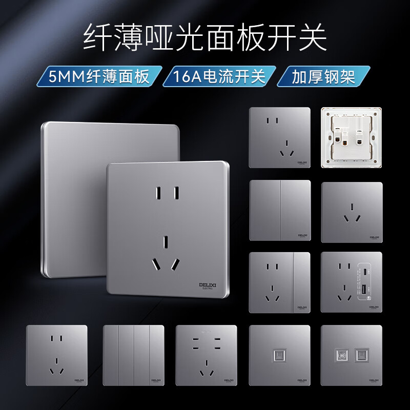 德力西(DELIXI)开关插座面板哑光290墙开无框大板86型暗装 超薄电源面板星空灰 Type-c+USB五孔插座价格:159.90元!
