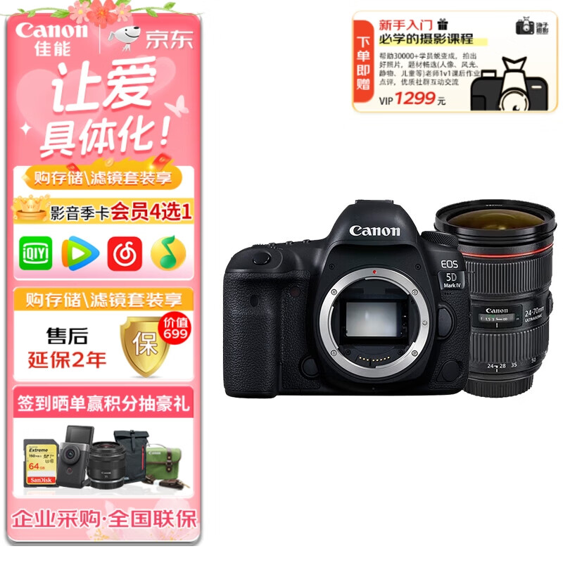 佳能(Canon)EOS 5D Mark IV +EF 24-70mm F2.8L II USM二代镜头 扫街旅拍套装价格:29999.00元!