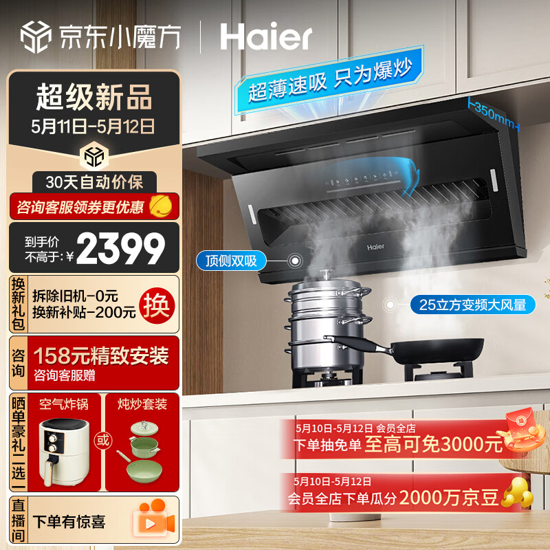 海尔(Haier)抽油烟机 顶侧双吸 7字型家用排烟机 25m3/min大吸力 齐平橱柜 挥手智控 自动清洗排吸烟机C61价格:2399.00元!