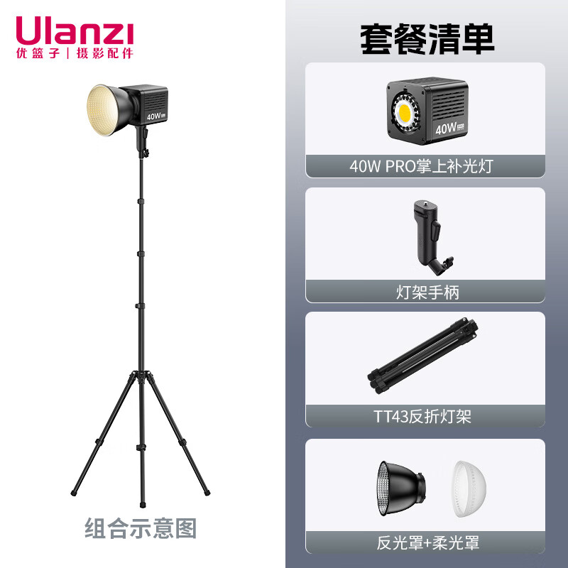 ulanzi优篮子 40W PRO掌上补光灯灯架手柄套装双色温内置电池COB灯摄影灯直播常亮灯柔光球直播摄影摄像价格:442.00元!