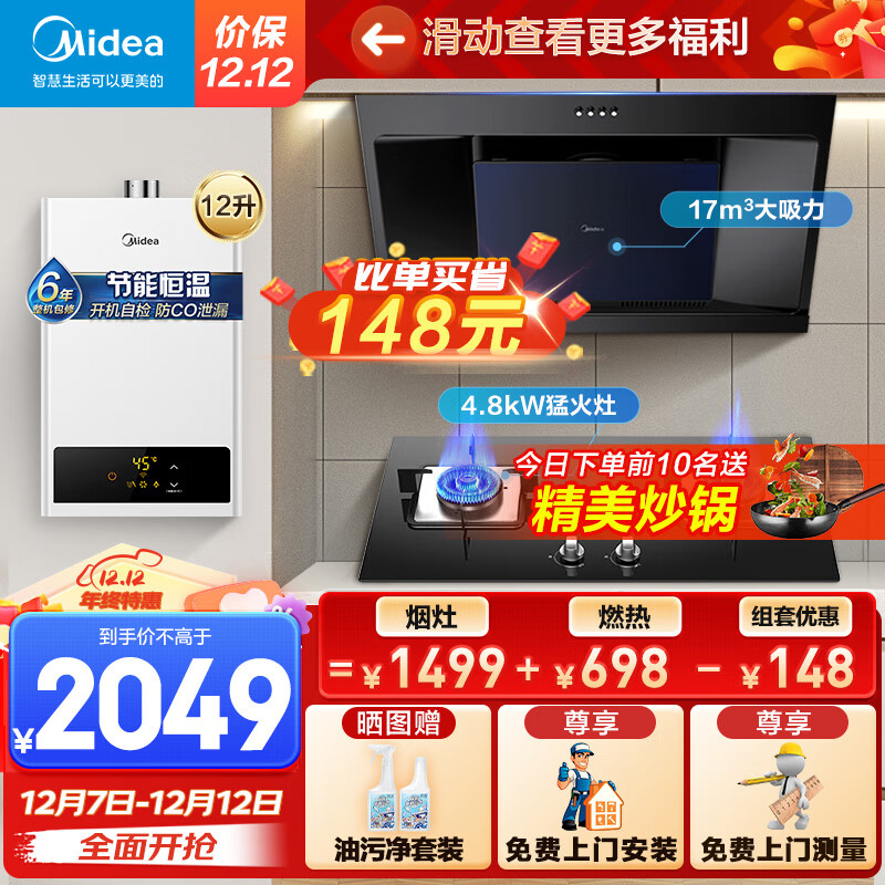 美的(Midea)侧吸抽油烟机灶具烟灶多件套装燃气热水器家用烟灶燃热厨房三件套JP11+Q217B+12HWF天然气价格:2049.00元!