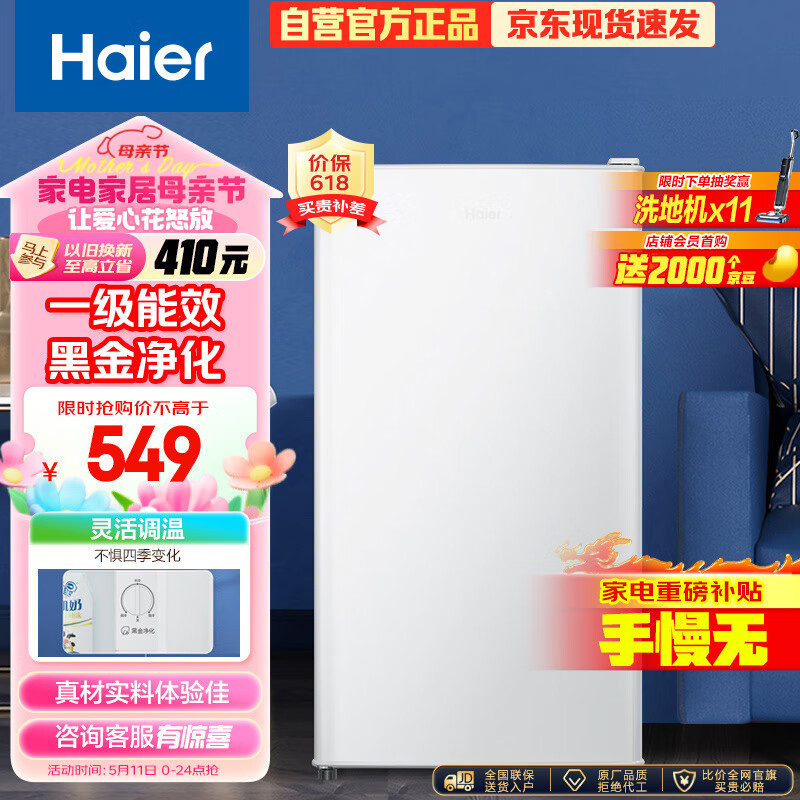海尔(Haier)90升单门电冰箱小户型迷你家用租房宿舍办公室一级能效省电低音微型多档变温2人可用BC-90GHSDE0W9价格:549.00元!