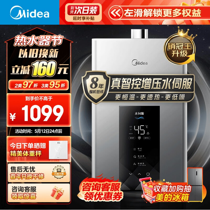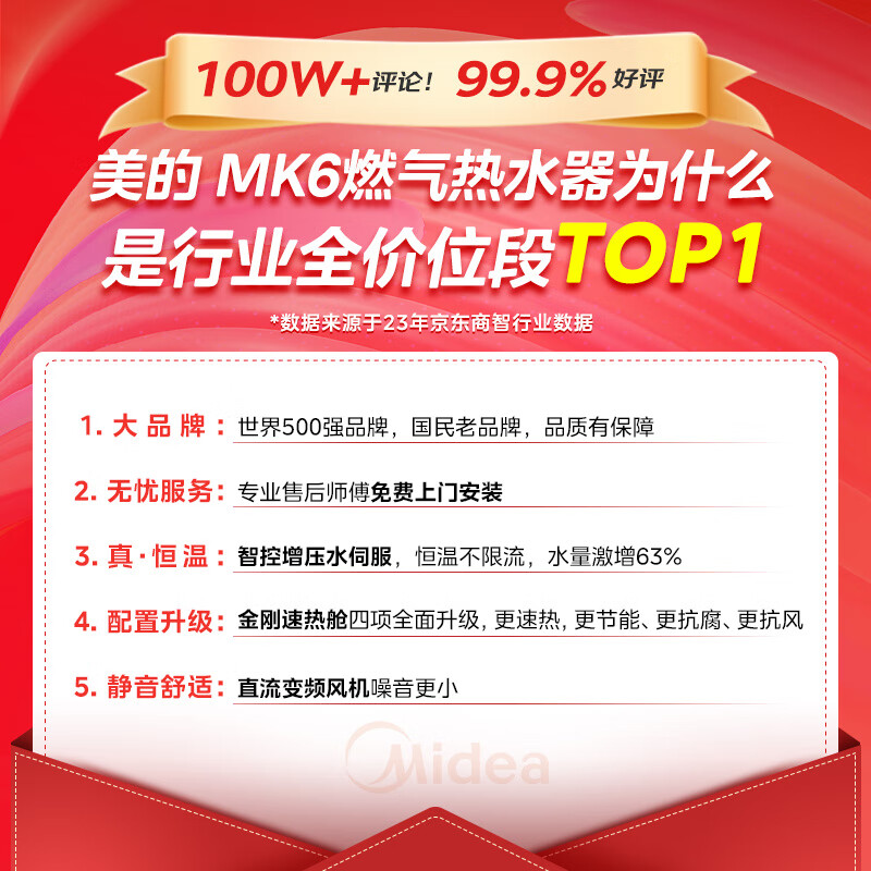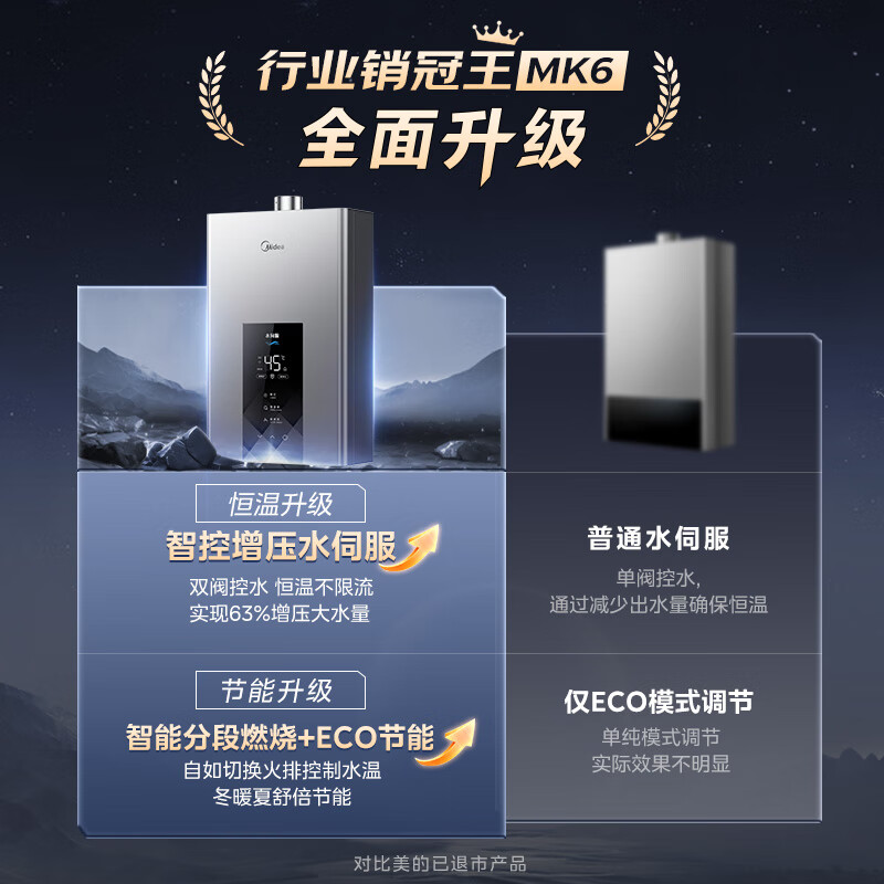 美的(Midea)13升燃气热水器 天然气 增压水伺服恒温 变频节能 开机自检 多重安防 金刚速热舱 JSQ25-MK6耀夜价格:1099.00元!