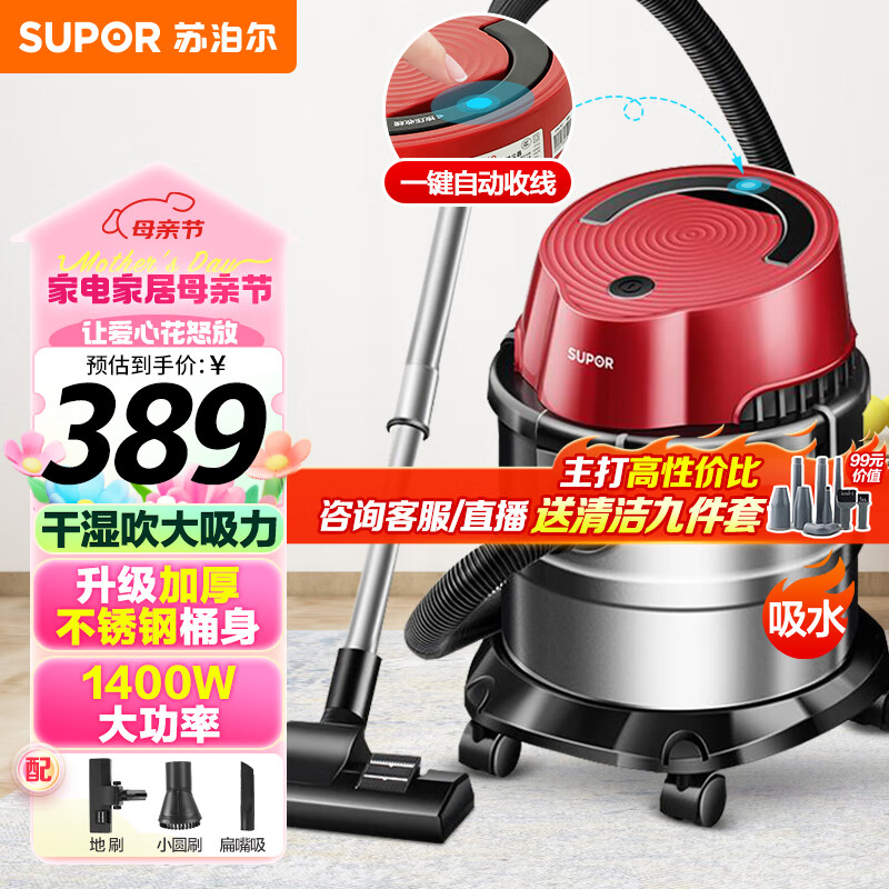 苏泊尔 (SUPOR )桶式吸尘器 家用大吸力多功能一键自动收线不锈钢商用吸尘器VCT86S价格:419.00元!