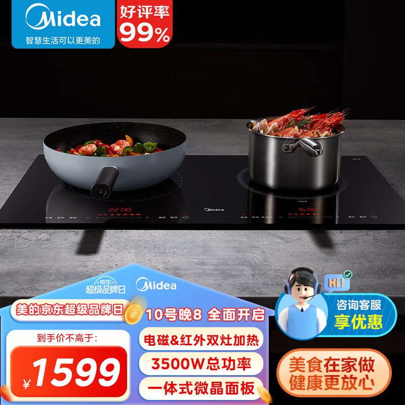美的(Midea)电磁炉双灶 电磁灶家用3500W大功率双头灶电陶炉 一电一陶嵌入式 定时功能滑触双控 MC-DZ35D05E价格:1599.00元!