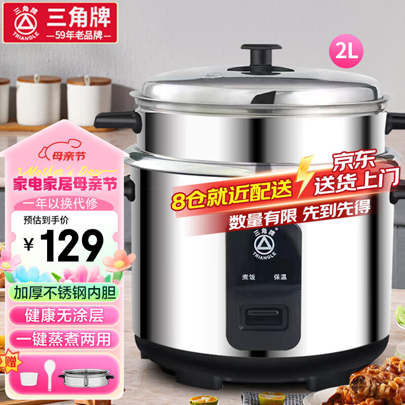 三角牌(Triangle)不锈钢电饭锅电饭煲无涂层内胆家用老式直身锅带蒸笼 ZD2L价格:129.00元!