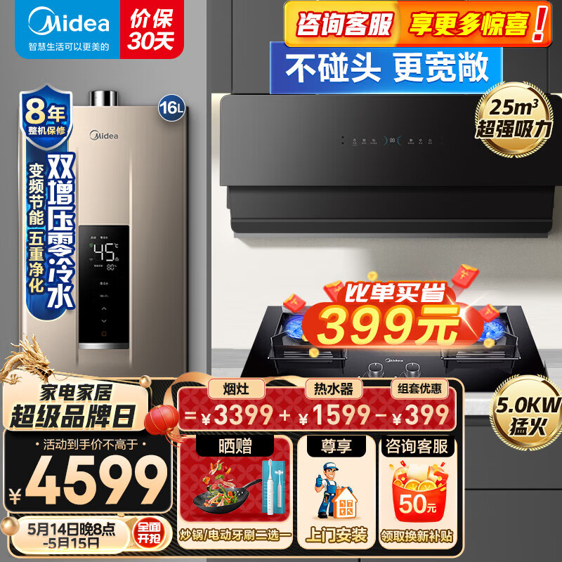 美的(Midea)侧吸抽油烟机灶具烟灶联动多件套装燃气热水器家用烟灶燃热厨房三件套JA7+Q523L+16NT1S天然气价格:4599.00元!