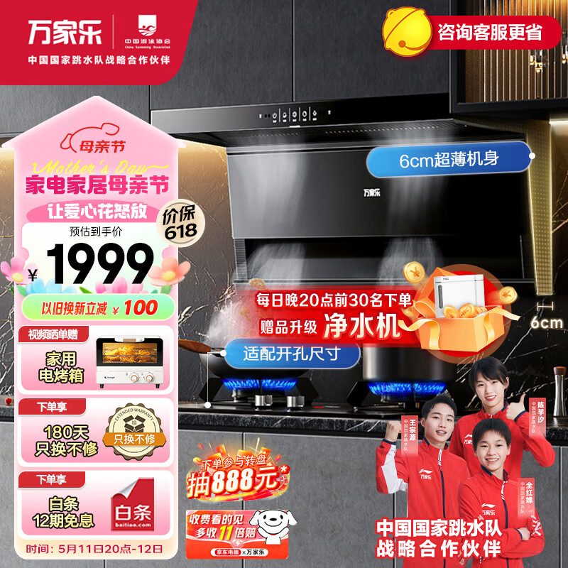 万家乐顶侧双吸油烟机 23立方抽油烟机烟灶套装自清洗 5.1kw大火力钢化玻璃燃气灶具套装TAK5+TAC5天然气价格:1999.00元!