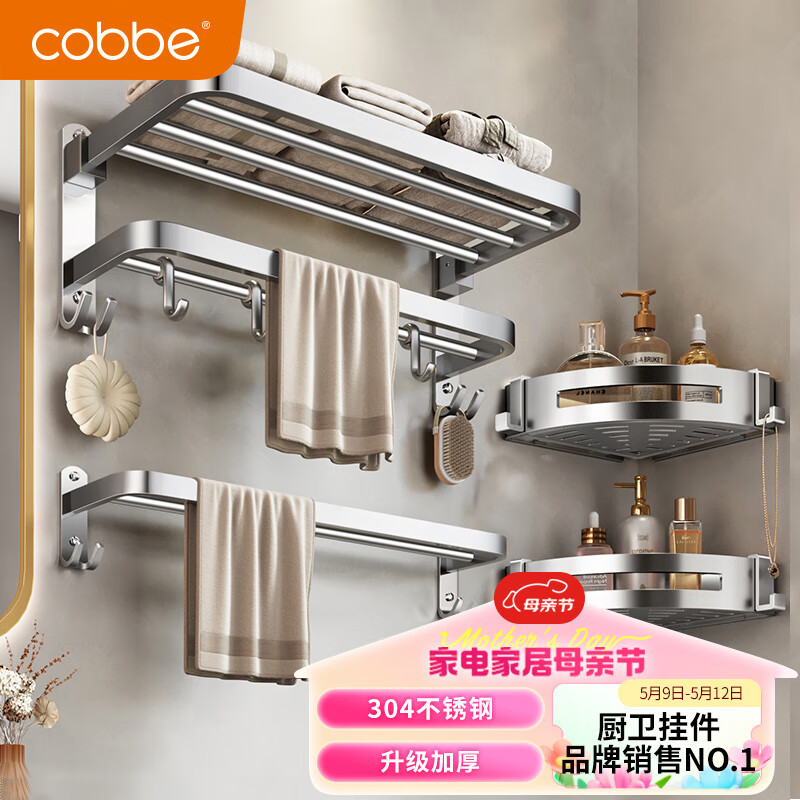 卡贝(cobbe)304不锈钢毛巾架浴室置物架卫生间浴巾架免打孔卫浴五金挂件套装价格:252.50元!