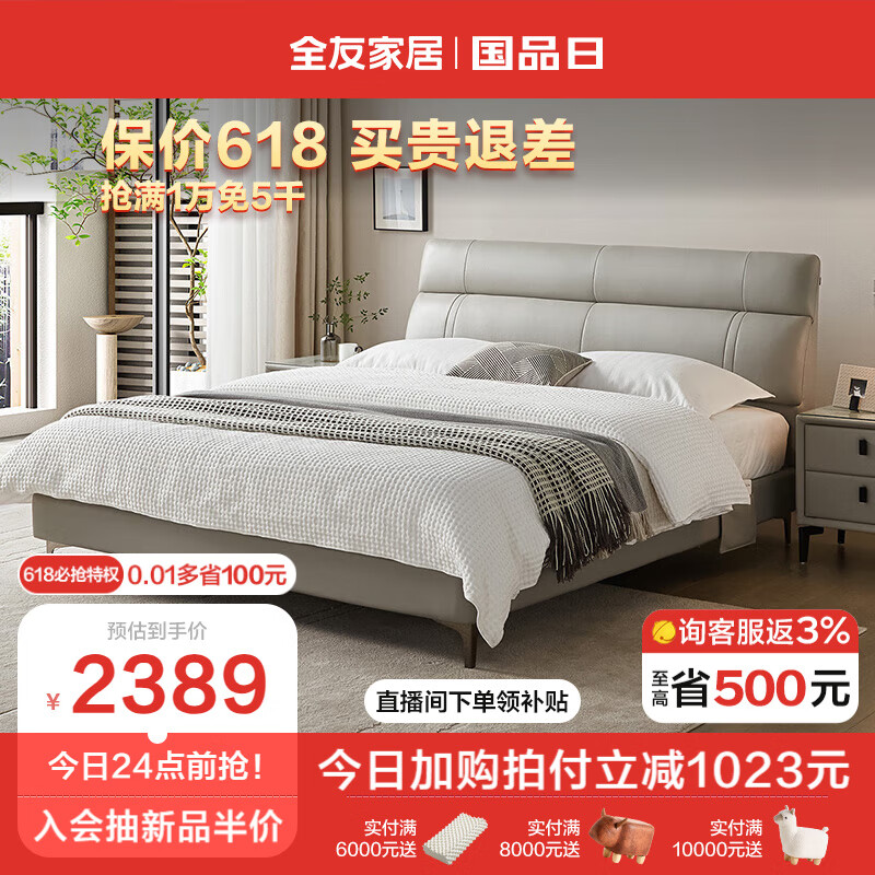 全友家居 真皮床 头层牛皮现代简约主卧室双人皮艺软包大床轻奢105251价格:3412.86元!