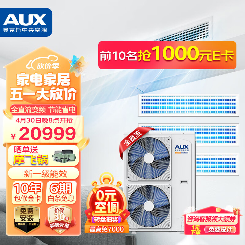 奥克斯(AUX)中央空调一拖三风管机空调6匹 家用多联机 全直流变频一级能效包安装嵌入式空调DLR-140W/DCJ2S-JM价格:20999.00元!