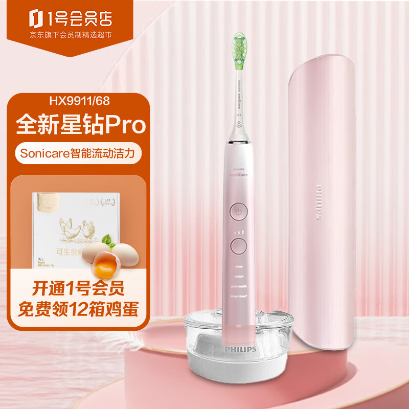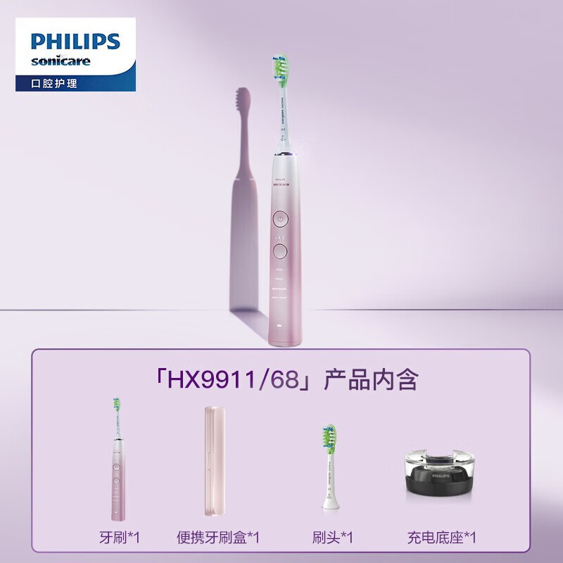 飞利浦电动牙刷钻石系列成人声波震动牙刷男友女友生日礼物智能APP可视化洁齿HX9911渐变粉价格:699.00元!