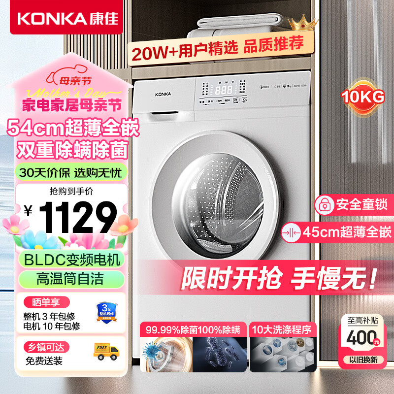 康佳10公斤滚筒洗衣机全自动 变频电机 大容量超薄全嵌 触控操作 除菌除螨 一级能效KG100-1205B价格:1129.00元!
