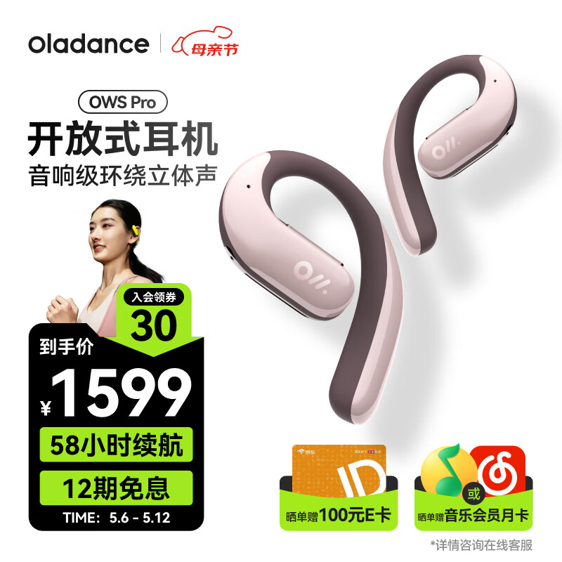OladanceOWS Pro 全开放式耳机(含充电仓)无线蓝牙不入耳防漏音运动耳机超长续航【ola小月牙】 薄晕烟粉价格:1599.00元!